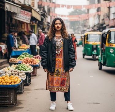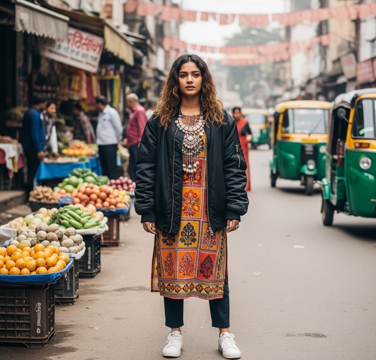 A trend that’s close to home — blending Indian ethnic prints, embroidery, and silhouettes with street-style essentials like sneakers and bomber jackets. It's modern, bold, and proudly rooted in tradition.